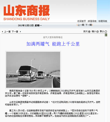 12月6日—9日,集團公司組織了以“山東交運集團80余部燃氣清潔能源環(huán)保客車助力春運”為主題的聯(lián)合新聞采訪活動。山東電視臺、濟南電視臺、《大眾日報》、《齊魯晚報》、《現(xiàn)代交通報》、《濟南日報》、《濟南時報》、《交通廣播》等8家新聞媒體紛紛派出記者組成聯(lián)合新聞采訪團,對集團公司本次購進燃氣清潔能源環(huán)保客車工作,從環(huán)保、節(jié)能、安全等方面,以關(guān)注民生、行業(yè)發(fā)展、春運動態(tài)等角度進行了深入采訪。