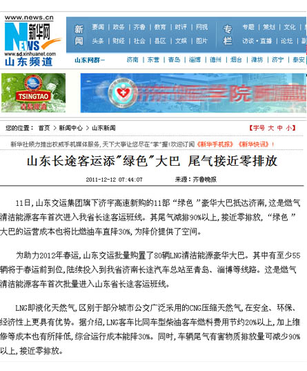 在采訪活動中,采訪團深入蘇州金龍客車制造車間,觀看了車輛從車架組裝、整車陰極電泳到制動配制等流水制造的全過程,體驗了客車制造的嚴密工序;在金龍客車廠產(chǎn)品展室,記者們了解了蘇州金龍客車廠的發(fā)展歷史及企業(yè)安全文化,對燃氣清潔能源客車所應(yīng)用的新技術(shù)、新工藝、新材料有了更進一步的認識;在蘇州金龍客車廠會議室,總工程師張衛(wèi)林將燃氣清潔能源客車與汽油、柴油等能源客車進行比對,向記者詳細介紹了燃氣清潔能源環(huán)保客車在安全、環(huán)保、節(jié)能等方面的優(yōu)勢;在“山東交運集團清潔能源環(huán)保客車交車儀式”上,各新聞媒體記者又對本次燃氣清潔能源環(huán)保客車車輛安全運營、節(jié)能減排、線路投放等情況,進行了現(xiàn)場采訪和隨行拍攝。12月9日晚22點,集團公司燃氣清潔能源環(huán)保客車車隊經(jīng)一路跋涉平安抵濟,12月10日晚,省電視臺山東衛(wèi)視頻道在《新聞聯(lián)播》欄目、濟南市電視臺濟南新聞頻道在《濟南新聞》欄目以及《大眾日報》、《齊魯晚報》、《山東商報》、《生活日報》、《現(xiàn)代交通報》、《濟南日報》、《濟南時報》、《交通廣播》等媒體都對集團公司燃氣清潔能源環(huán)保客車投入春運情況進行了重點報道。
