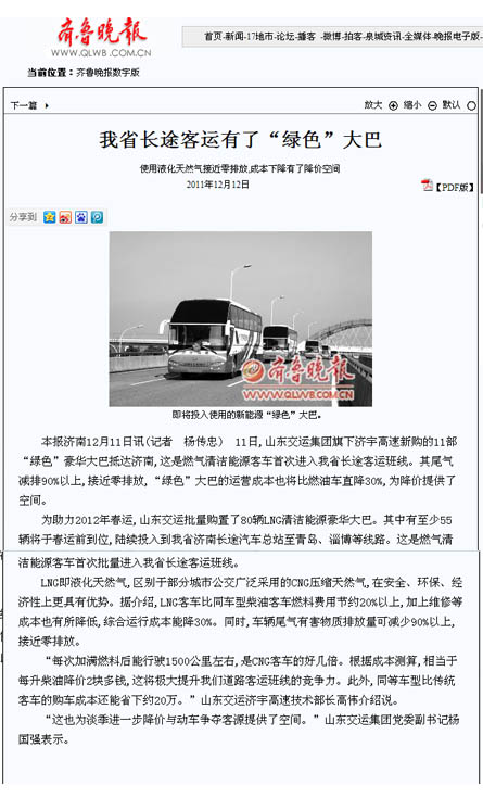 長期以來,集團公司高度重視節(jié)能減排工作,積極利用培訓、比賽等方式,解析節(jié)能方法,測定油耗標準,推動節(jié)能減排工作深入開展。本次集團公司濟宇高速新購進11輛燃氣清潔能源環(huán)保客車,是集團公司調(diào)整車輛結(jié)構(gòu),優(yōu)化運輸組織,提高企業(yè)核心競爭力、創(chuàng)建節(jié)約型企業(yè)的戰(zhàn)略任務(wù)之一。是進一步貫徹“兩保兩樹”和“對標·精細化管理增效年”、“創(chuàng)先爭優(yōu),爭做交運先鋒”活動的重要載體,為積極做好本次接車新聞宣傳工作,集團公司早部署早發(fā)動,認真組織全面策劃,收集素材擬寫新聞通稿,多方聯(lián)系溝通協(xié)調(diào)。12月6日,集團公司黨委副書記楊國強帶領(lǐng)山東電視臺、濟南電視臺、《大眾日報》、《齊魯晚報》、《現(xiàn)代交通報》、《濟南日報》、《濟南時報》、《交通廣播》等8家新聞媒體,以及黨委組宣部、濟宇高速相關(guān)工作人員,前往蘇州金龍客車廠,以“山東交運集團80余部燃氣清潔能源環(huán)保客車助力春運”為主題,進行了全面深入的聯(lián)合新聞采訪。