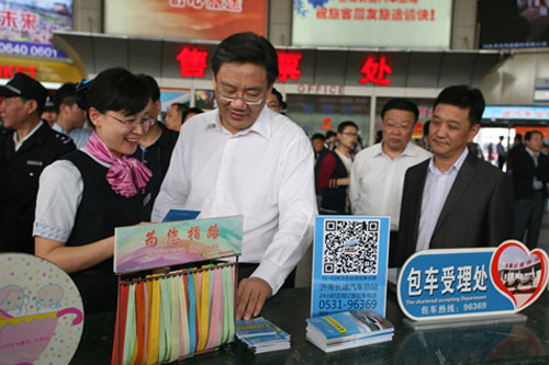 2015年4月29日,山東省委常委、濟南市委書記王文濤在市委常委、秘書長楊峰、市委副秘書長岳紹紅、市交通運輸局黨委書記、局長蔣向波的陪同下,來到集團濟南長途汽車總站調(diào)研“五ּ一”運輸安全保障工作。集團公司董事長、黨委書記吳宗昌、副總經(jīng)理田景東、總經(jīng)理助理齊杰、安全總監(jiān)朱永順等集團領(lǐng)導(dǎo)陪同視察。