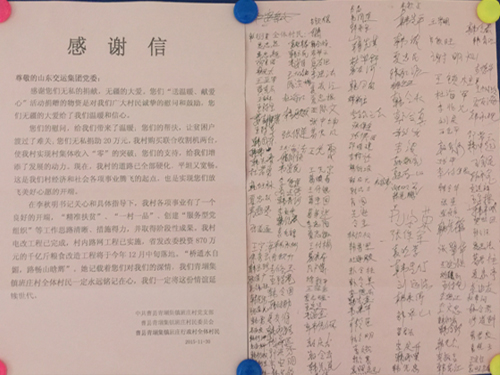 您現在的位置是:首頁 > 集團要聞 集團黨委收到“第一書記”幫扶貧困村感謝信 次 集團要聞 發布時間:2015-12-11 16:05:56 集團黨委收到 “第一書記”幫扶貧困村感謝信 近日,集團黨委收到一封來自菏澤曹縣青堌集鎮班莊村黨支部、村民委員會和全體村民的聯名感謝信。信上密密麻麻寫滿204名村民的簽名,他們懷著無比感激的心情,用最質樸的方式,表達了全體村民對集團黨委在 “第一書記”扶貧幫扶工作中“真心實意辦實事、扶貧濟困見真情”的感激之情。