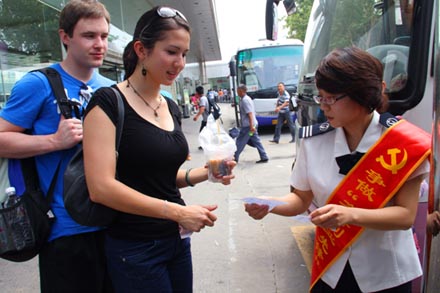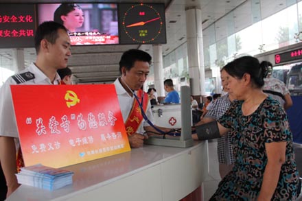 在總服務(wù)臺,總站南區(qū)雷鋒大夫魏德泉為乘車旅客提供免費義診和夏季乘車健康咨詢服務(wù);由車站微機室、后勤科組成的電子維修組,為旅客提供免費的手機充電器,提供免費電子、電器簡單維修服務(wù);由一線服務(wù)科室黨員組成的服務(wù)咨詢組在公交站牌、旅客中轉(zhuǎn)換乘區(qū)設(shè)立了免費咨詢服務(wù)崗,為旅客提供免費咨詢和行李運送服務(wù),并在長廊設(shè)立了“黨員送水車”,為旅客提供免費送水服務(wù),得到了旅客的一致好評。
