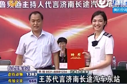 主播代言 提升形象  作為2013年齊魯頻道《魅力新主播》冠軍選手,王蘇成功代言濟南長途汽車東站,在十月一日當天來到車站最平凡的工作崗位上,現場體驗了售票、檢票、問詢、引導等崗位的工作。而即將聯手齊魯頻道推出的“農民工公益贈車票”、“主持人進校園、進社區宣講安全知識”等一系列主題活動,將進一步推動公益服務民眾,倡導旅客安全、文明出行。