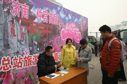“站運(yùn)游”開辟新市場。隨著“仲宮首屆桃花節(jié)”的開幕,總站客運(yùn)營銷中心瞄準(zhǔn)火爆的賞花游市場,在44日——412日全力打造總站至仲宮波羅峪景區(qū)旅游專線,為廣大旅客提供欣賞桃花的專線班車。不僅如此,總站積極與波羅峪景區(qū)聯(lián)系,由景區(qū)提供200張免費(fèi)門票,免費(fèi)贈(zèng)送給現(xiàn)場參與活動(dòng)的旅客。活動(dòng)一經(jīng)開展,就吸引了廣大旅客的熱情參與,僅清明三天假期,總站站前廣場就發(fā)送近郊游旅客近1000人,實(shí)現(xiàn)客票收入36000余元。