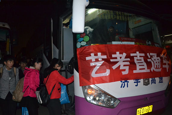 226日,濟南長途汽車總站的10余輛“藝考直通車”開進了濟南藝考培訓基地,接送廣大學子前往青島、聊城等地趕考。
